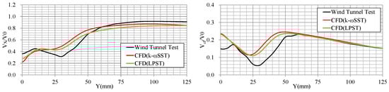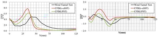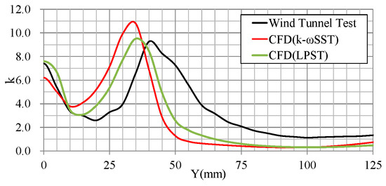As shown in Figure 15, Figure 16, Figure 17 and Figure 18, the RSM-LPST is closer to EFD from Y = 0 to 75 mm. The peak magnitude and location of the RSM-LPST closely resembles the EFD values for the k-omega SST in terms of , , , , and k. On the other hand, the range above Y = 75 mm is almost the same for both turbulence models.