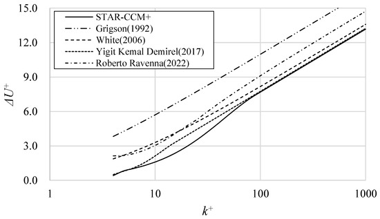 where is the friction velocity, is the characteristic roughness length scale, and is the kinematic viscosity. As shown in Table 6, various coefficients have been proposed with , , , and as parameters. Yigit Karmel Demirel et al. (2014) [20] and Soonseok Song et al. [21] used the same parameters as the default parameter of Star-ccm+. Yigit et al. (2017) [22] calibrated their coefficients to align with the experimental findings of Schultz et al. [23] Andrea Farkas et al. [24] and Henrik Mikkelsen et al. [25] also used the same parameters. Roberto et al. [26] juxtaposed the parameters of White et al. [27] and Grigson [28], as illustrated in Figure 19. In our investigation, we adopted the values from Yigit et al. (2017) and fine-tuned them to accommodate the lower range.