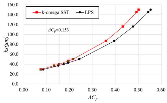 As depicted in Figure 20, although both the k-omega SST and the RSM-LPS exhibit a similar trend for , is larger for the k-omega SST. Specifically, according to the ITTC 1990 equation, = 0.153 × 10−3 corresponds to = 40 μm for the k-omega SST and = 37 μm for the RSM-LPS.