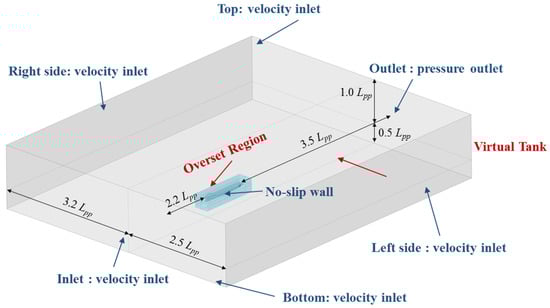 From Figure 2, a Cartesian coordinate system is fixed on the ship, with positive x, y, and z axes pointing to the upstream, portside, and upward directions in sequence. The origin is set as the intersection of the central longitudinal section, the midship section, and the water plane, and the vessel is upright without any trim at the beginning. The length of the computational domain starts from 2.7 Lpp to 4.0 Lpp in the longitudinal direction, while the width from 3.2 Lpp to 2.5 Lpp in the horizontal direction due to the symmetrical incoming flow. The construction of the virtual tank in the height direction is defined as consistent with the depth of the maneuvering basin in the NMRI. The setup of boundary conditions is summarized in Table 2, including the velocity inlet, the pressure outlet, and no-slip walls. To eliminate the effect of boundaries, a wave damping zone is specified near the rear part of the virtual tank.