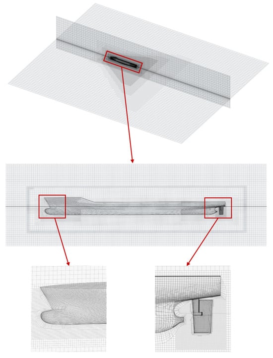Figure 3 displays the mesh structure of simulation. The trimmed mesher and the surface remesher are applied for mesh discretization. The latter is employed to generate volume meshes, while the former is used for surface meshes. Specifically, the prism mesh was generated at the boundary layer close to hull surfaces, with a layer number of six. To satisfy the requirement of 30 < y+ < 100, the total thickness of the boundary layer is limited to 0.042 m. For a reasonable mesh distribution instead of a uniform grid, three refinement levels are identified from inside out. The interface of the two-phase flow is another refinement region to capture the elevation in the free surface precisely. Additionally, the VOF method, one of the multiphase flow models, is adopted to identify phases of water and air. Taking the complexity of specific geometric structures into consideration, local mesh refinement is also implemented in parts including the bow, the stern, and the rudder. A three-degree-of freedom vessel is investigated by solving the equations for rigid body motion, including heave, pitch, and roll motions during the simulation.
