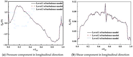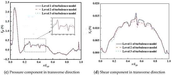 In order to carry out an intuitive comparison of results obtained with different turbulence models, the longitudinal force and lateral force are plotted under an Fr of 0.20 as displayed in Figure 5. During post-processing, the ship hull is divided into 100 parts at an interval of Δx/Lpp = 0.01. Values of each part can be obtained by means of integration according to the active area. The force induced by pressure and viscous effect are designated as subscripts p and s, respectively. For instance, physical quantity Xp represents the part of longitudinal force deriving from pressure while Ys denotes the part of lateral force resulting from friction. The drift angle is chosen as 12° for a more conspicuous separate flow in the virtual test. In the figure, the ordinate represents the variation in the longitudinal direction with a non-dimensional parameter x/Lpp for convenience, while the abscissa represents the values of forces. From the gradient of value, the pressure component makes a major contribution, particularly in lateral force. The grey line indicates data related to the SST κ-ω model, while the red line and blue line correspond to level 2 and level 3 of turbulence models, respectively. The diversity of the turbulence model can be observed facilely in forces stemming from the viscous effect of water, especially in the range of x/Lpp = 0.45~0.70. To put it another way, the discrepancy between curves of the pressure component in different colors is not as distinct as that of the shear component, which is consistent with results in Table 5.