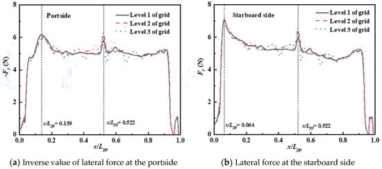 Figure 6 displays the distribution of sway force on both sides along the longitudinal direction under different grid sizes, which is also integrated by uniformly distributed sections with the same Δx. For an intuitive comparison, it has to be stressed that negative values on the portside are plotted. Under the condition of a 12° drift with vm = 1.1 m/s, a smoother transition can be noticed with the fine grid. In other words, an increase in the grid number can bring about an improvement in accuracy to some extent. Nevertheless, when the grid number reaches a certain value, the promotion of accuracy may be negligible regarding the consumed computing resources. For convenience, we take the bow of the hull as the position of x = 0, and stern of the model as x = 1. From lateral force acting on the portside, peak values emerge at the distance of x/Lpp = 0.139 and 0.522, which is independent of grid size. Such a phenomenon also takes place when it comes to the starboard side, with a different peak point at x/Lpp = 0.064. In addition to the location of the peak value, discrepancy also exists between the magnitude of lateral force on two sides, which can be attributed to the influence of the drift angle, irrelevant to the refinement of the grid in this research. Combined with GCI values, the intermediate set of grid size, which equals 0.07 m, could satisfy the calculation accuracy of hydrodynamic force.