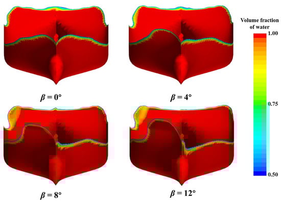 With the transformation of the drift angle, the incident direction of incoming flow alters while positioning of the vessel remains. To illustrate the interaction between the vessel and fluid, Figure 7 depicts the volume fraction of water at the bow. Under the drift angle of 0°, the distribution of water is the same on two sides of the hull. When the drift angle increases from 0° to 12°, the discrepancy between two sides can be easily observed, especially in the case of a 12° drift angle. The larger the drift angle is, the larger the difference between crests at the portside and the starboard side will be.