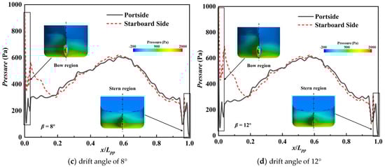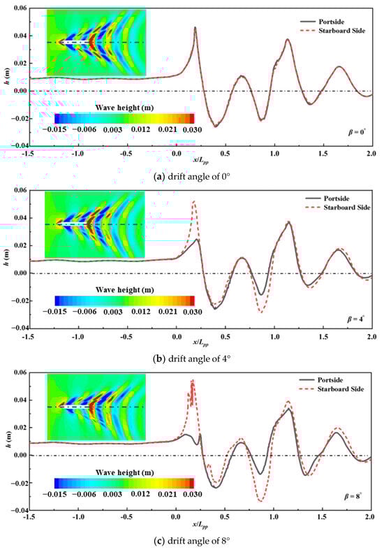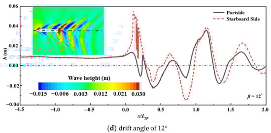 For a clear representation of wave elevation, Figure 8 displays the top view of the free surface at an interval of 4° for the drift angle. The wave height at the portside and the starboard side correlates to the distribution of pressure on the hull, which is closely bound up with the acting force attributed by fluid. Apart from this, contours of the wave pattern are also displayed in Figure 8 as supplementation. The grey line denotes the portside while the red line represents the starboard side, both of which are extracted at sections located 0.072 Lpp away from the longitudinal section. Under different drift angles, the diversity of wave height concentrates on the region of x/Lpp = 0~1. In particular, critical positions can be observed near x/Lpp = 0.177 and x/Lpp = 0.828, which correspond to the regions of the fore body and the aft body, respectively. Under the 4° drift condition, the wave surface ahead of the bow is conspicuously elevated at the starboard side, with a maximum difference in wave height of 0.027 m. Accompanied by the increase in the drift angle, more obscure deviation in wave height at two sides can be observed. The dispersed waves at the portside vanish gradually with the opposite situation observed at the other side, especially in the bow region.