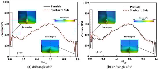 During the oblique towing test, the onset of the included angle between the incoming flow and the vessel will give rise to pressure differences around the hull, which can be attributed to the asymmetry of the fluid at the portside and the starboard side. It is undeniable that hydrodynamic forces and moment exerted on the vessel are deeply dependent on the flow field. From Figure 9, divergence can be observed between longitudinal distributions of pressure in drift angle tests, especially in the region of x/Lpp = 0~0.2. Similarly, the difference of pressure distributed at two sides is more significant with an increase in the drift angle. The existence of a bulbous bow exaggerates the difference originating from the oblique flow. After development along the longitudinal direction, there is a minor discrepancy between pressures on the two sides.