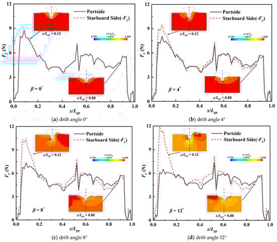From the oblique flow field, the diversity between the lateral force at the portside and the starboard side along the longitudinal direction becomes more conspicuous with a larger drift angle, especially in the bow region.