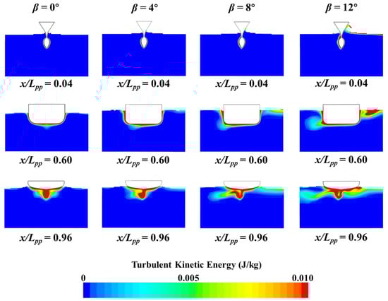 The longitudinal evolution of turbulent kinetic energy is depicted in Figure 11. The asymmetry can be easily observed when the drift angle increases, which shows consistency with that of the longitudinal velocity component. Nevertheless, the magnitude is underestimated due to anisotropy in a Reynolds Stress Transport model [28]. As a result, these contours are merely appropriate for the reflection of a certain distribution pattern.