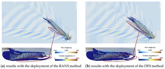With keen attention paid to detailed flow separation and realistic demand for an authentic representation of the real physics, researchers are in persistent pursuit of capturing vortex structures. In a gesture to look deeper into the physical mechanisms of the asymmetrical flow field, a comparison is made with the method of the RANS model and DES model [29]. The main time-averaged vortical structures occurring around the ship hull under a static drift condition of 12° are illustrated in Figure 12, together with the position of fluid in contrast to the free surface. For vortex identification, the iso-surface of the Q-criterion [30] is displayed with a threshold of 50, which is colored by the vorticity magnitude. The major vortex structure is the windward sonar dome tip vortex (WW-SDTV). It can be clearly distinguished from the sonar dome end tip. Under the premise of an identical grid refinement method at the same location, the discrepancy in the evolution of the WW-SDTV can be easily detected when utilizing two different models. In Figure 12b, the vortex stretches to a longer range along the hull. To put it another way, the progressive damping of the WW-SDTV simulated by the RANS method is faster. Concerning the stern vortex (SV), more detailed vortex structures are visible when utilizing the DES method. Apart from this, a smoother transition of the kelvin wave is observed, indicating a better solution over the wake field.