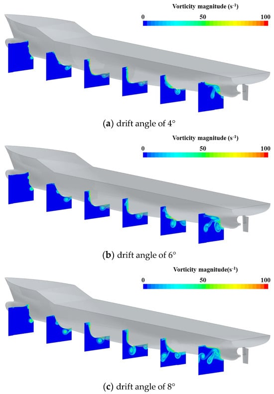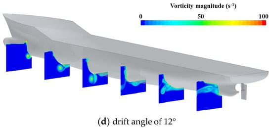 For the research on flow separation and vortex shedding, the development of the vortex in the direction of incoming fluid is demonstrated in Figure 13, with the extraction of six sections along the hull. From longitudinal vorticity contours, the deflection of the vortex is inconspicuous until the stern region in the 4° static drift test. Under high drift angles, the evolution of the vortex at the portside is more violent, especially for 12° DES simulation.
