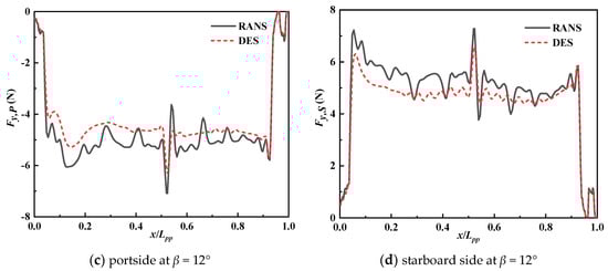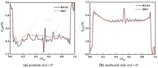Figure 14 depicts the simulation results of lateral force using the RANS method and DES method. Two drift conditions are investigated, including drift angles of 6° and 12°. Subscripts of ‘P’ and ‘S’ in plots stand for the portside and starboard side, respectively. Disparities are mainly distributed at the portside, where incoming fluid originates. An abrupt variation of Fy,P solved by the RANS method is visible around the center of the vessel in Figure 14a, with a maximum value and a minimum value. However, the distribution pattern obtained by the DES method, representing a smoother transition at the portside, does not match that of the RANS method. Concerning the starboard side, divergence can hardly be observed when the drift angle is 6°. When the drift angle increases to 12°, the variation tendency of Fy,S calculated by DES is similar to that of the 6° static drift condition, showing distinct differentiation from the results of the RANS method. As illustrated in Table 8, the dimensionless sway force acting on the hull under the condition of β = 6°, solved by the DES method, is 2.412 × 10−2. The corresponding relative error compared with experimental data is 3.17%. For the 12° static drift test, the value of Y′ predicted by the DES method is 6.168 × 10−2, which is close to the result achieved from the RANS method as shown in Table 7. The above analysis demonstrates the outperformance of the DES method in capturing details of vorticities, which is in accordance with the conclusion from predecessors’ work [17]. For the sake of predicting hydrodynamic forces and moments, the utilization of the RANS model is preferable, taking efficiency and accuracy into account.