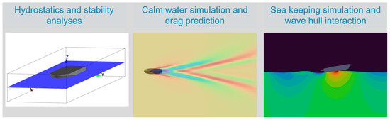 Figure 1 reports the types of simulations developed within the LincoSim platform: hydrostatics/stability, calm water, and seakeeping simulations. Seakeeping simulations, i.e., wave–hull interaction, present automation challenges and their implementations within the LincoSim are still ongoing. For this reason, the simulations were performed using a standardized workflow by means of a command line interface (CLI) instead of using the LincoSim web interface as was possible for the calm water simulations.