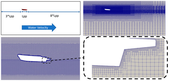 The hull length is used to define the domain extent, as shown in Figure 2 in the top left box and the mesh refinements boxes positioning, while the hull speed is used to define the near wall cell height targeting a dimensionless wall distance (y+) value of about 100; similar settings have been proposed more recently by [24]. The turbulence model selected is the SST k-ω, see [25], which is recognized to be effective in the marine field of application. Standard wall functions are applied. The time step is fixed and is set to ensure, for the given nominal hull velocity, a Courant number value lower than unity. For the lower and higher Froude numbers, the value of the time step is set to 0.00372 s and 0.000165 s, respectively. The CFD model is solved using the interFoam solver as available from the OpenFOAM toolbox. The hull is studied by imposing a symmetry plane at the hull mid-section (half hull). Using this approach, the average mesh cell count is about two million. We underline that this approach has only been tested and validated for the model scale; nevertheless, considering the research applications for full-scale CFD models, like [26], we are looking forward to having a bettser understanding of its applicability for full-scale CFD modeling.