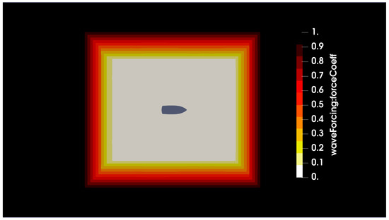 Also, the forcing zones and forcing parameter values have been set according to [27]. In Figure 3, an example of the forcing zone is shown. The general idea is to force the wave equations on an external frame, which is not too close to the hull position and let the solution of the Navier–Stokes equations adapt to the forced condition, transporting the wave into an internal frame directly surrounding the hull. A set of numerical parameters must be defined to simulate waves following such a kind of forcing zone approach: the most important ones are the frame extents, the forcing strength, and the spatial forcing shape function.