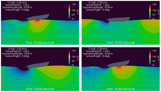 The qualitative outcomes are presented in Figure 4, where the pressure flow field distribution around the hull is shown over four successive time instants.