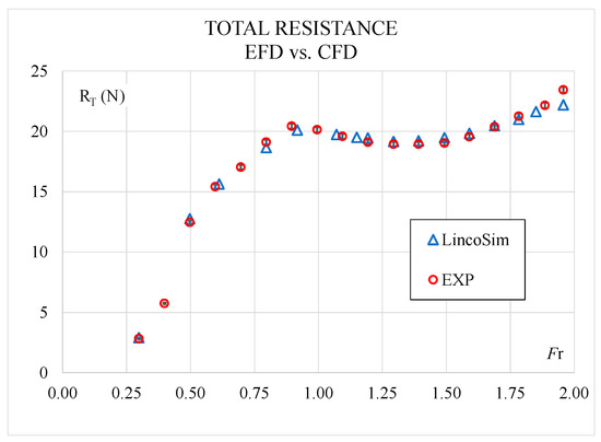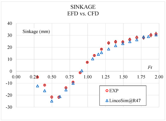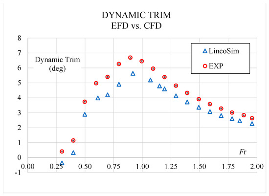 From Figure 6, Figure 7 and Figure 8, can be observed that resistance is predicted very well and the average error through all the speed range is 1.84%. For the dynamic trim, the average difference is 6.87%, but the EFD and CFD curves are perfectly aligned with constant offset. In absolute values, the maximum difference is 0.63 deg at Fr = 0.80, where the hull has its maximum trim of 6.26 deg. The average difference for sinkage is 6.94% and it can be seen from Figure 8 that, globally, it has a good agreement, but for some points at low Fr, it shows larger differences.