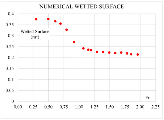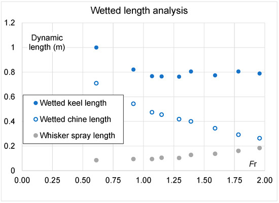 Therefore, the numerical results have been further analyzed to report the wetted lengths and wetted surface in the whole speed range. The visualization in ParaView© is performed using the free surface 3D obtained with an iso value of 0.5 for the alpha.water field and the hull pressure distribution. An example of the data elaboration in ParaView©, together with the photo from the towing tank at Fr = 1.96, is provided in Figure 9. The obtained values of the dynamic wetted surface are summarized graphically in Figure 10, while the wetted lengths on the keel, chine and whisker spray on chine are reported in Figure 11 for the whole range of Froude numbers.