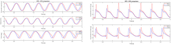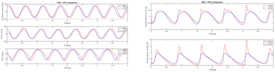 In this work, the comparison, as the first step in the seakeeping calculations by LincoSim, of only the time series has been analyzed in detail. In Figure 12 and Figure 13, a sample of 4 s of the time series of the EFD and CFD is shown, at Fr = 0.99 and 1.49, respectively. In both figures, the comparison of the EFD (red lines) and CFD (blue lines) data is provided for selected quantities: encounter wave, heave, pitch on the left side and acceleration at CG and at bow position on the right side.