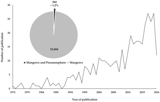 Historic mangrove and pneumatophore publications. The line graph shows pneumatophore-related publications over time. The pie chart depicts the share of pneumatophore publications out of the total number of mangrove publications (total number of papers on mangroves from 1846 to 9 May 2024 was 32,060, while the number on mangroves and pneumatophores from 1974 to 9 May 2024 was 384).