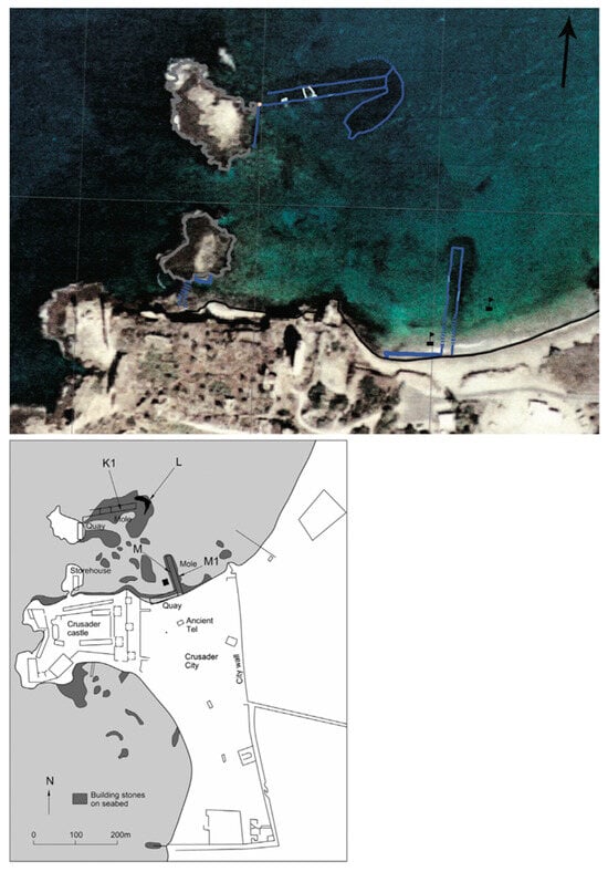 Satellite image of the Atlit harbor and its plan (indicating excavation areas K1, L, M, M1) [17].