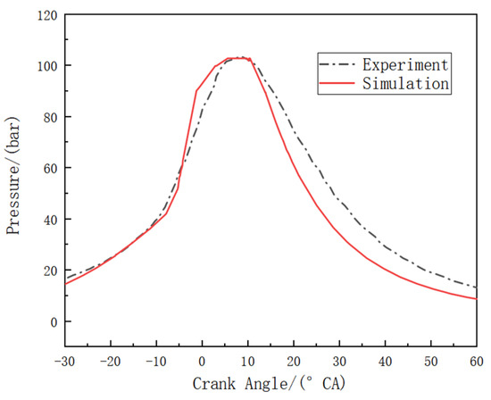 The model verification in this study was conducted on a Wärtsilä DF32 engine (Wärtsilä, Helsinki, Finland) [19]. Specific engine parameters are presented in Table 2. The experimental setup involved the injection of ammonia through the intake manifold. The ammonia was ignited with a small amount of diesel fuel. Numerical simulations were performed under conditions of an ammonia premix equivalence ratio of 0.7 and an initial cylinder pressure of 1.112 bar on an ammonia–diesel engine with an ammonia energy fraction of 72.16%. The validation of the pressure during the in-cylinder combustion process is shown in Figure 1. From the figure, it can be seen that the pressure curve obtained from the numerical simulation is generally consistent with the experimental curve, with the simulated pressure slightly lower than the experimental values in the later stages of combustion. However, the peak pressures in simulation and experiment are almost the same. The maximum error in cylinder pressure is about 8.4%. Considering that the simulation used a zero-dimensional model and mixed ammonia and air uniformly in the cylinder, there can be differences from the actual cylinder conditions during the experiment. In addition, n-heptane was used in the simulation to model the combustion characteristics of diesel fuel, which cannot fully explain the combustion differences caused by the various components in the actual diesel fuel, which inevitably leads to a certain degree of error. Overall, the combustion of ammonia–diesel dual-fuel engines can be represented by the established zero-dimensional model.