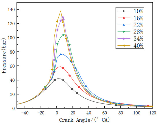 The cylinder pressure at different diesel energy ratios.