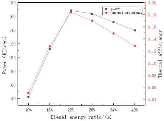The power and thermal efficiency at different diesel energy ratios.