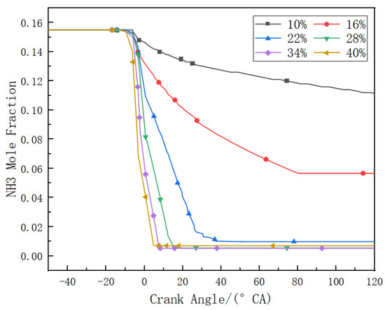 The variation of the ammonia fuel mass fraction at different diesel energy ratio conditions is shown in Figure 5. Ammonia is consumed slowly at first, followed by a rapid rate of consumption. Under conditions where the diesel energy ratio is greater than 22%, the ammonia is almost completely consumed with only a small amount of leakage. The more diesel is injected, the more intense the reaction inside the cylinder. However, under conditions where the diesel energy ratio is 10% and 16%, the total energy of the fuel mixture is low and normal combustion phenomena cannot occur inside the cylinder, resulting in a large amount of unreacted ammonia leakage, thereby causing serious environmental pollution.