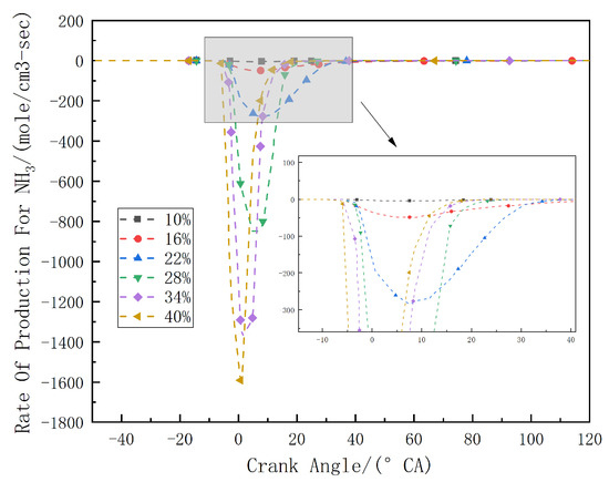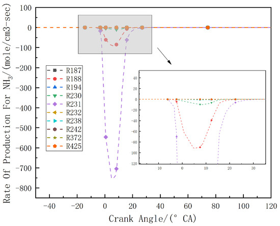 Figure 6 shows the overall reaction rate of the ammonia fuel at different diesel energy ratios. Overall, there is no apparent positive portion in the reaction rate, indicating a continuous consumption of ammonia during the combustion process. As the diesel energy ratio increases, the consumption rate of ammonia fuel increases significantly. The increase in the diesel energy ratio accelerates the increase in the cylinder temperature, which leads to an earlier start of the combustion and promotes the progress of the reactions related to the ammonia consumption-related species. This indicates that an increase in diesel quantity results in a more intense reaction of the ammonia fuel.