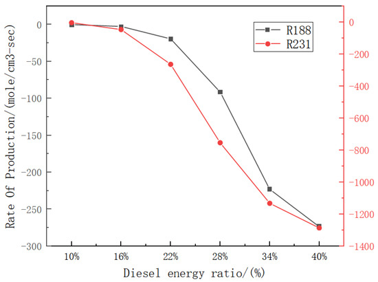 The reaction rates of elementary reactions R188 and R231 at different diesel energy ratios.