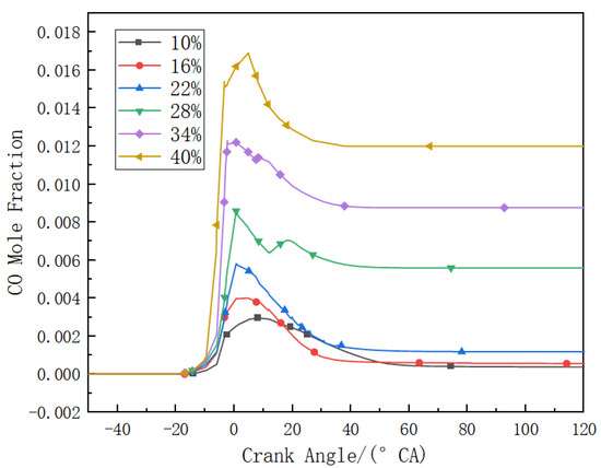 Mole fraction of CO at different diesel energy ratios.