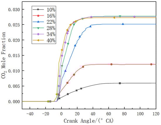 Figure 9 and Figure 10 show the simulated curves of the variation of the mass fractions of CO and CO2 at different diesel energy ratios. It can be seen that as the diesel energy ratio increases, both the production rate and the emissions of CO and CO2 increase. This is attributed to the increased amount of carbon-based fuel injected. Considering that carbon in combustion originates entirely from diesel, a higher diesel energy ratio leads to higher emissions of carbon oxides. The production of CO exhibits a trend of initially increasing and then decreasing; the production of CO2 exceeds that of CO. At a diesel energy ratio of 28%, the production of CO2 is approximately four times that of CO.