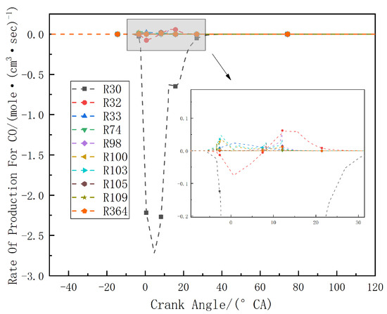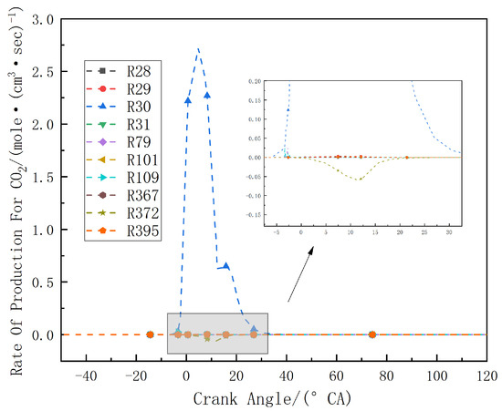 Through this study, it was found that during the combustion process, CO is primarily consumed. However, there are important reactions where it is also produced, like CO2, which is primarily produced. The consumption of CO and the generation of CO2 are mainly achieved through the reaction R30: CO + OH <=> CO2 + H, where CO is oxidized to CO2. This clearly explains why the mole fraction curve of CO increases initially and then rapidly decreases with an increase in crankshaft angle and why the production of CO2 is higher than that of CO.