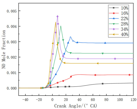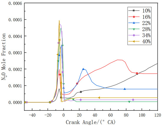 Nitric oxide (NO) is considered a major precursor to ground-level ozone and atmospheric environmental pollution, while nitrous oxide (N2O), as a major driver of global climate change, is a significant greenhouse gas with an impact on temperature nearly 300 times greater than carbon dioxide. It takes approximately 120 years for N2O to completely decompose in the atmosphere [34,35]. Figure 14 and Figure 15, respectively, show the mole fractions of NO and N2O under different diesel energy ratios. The higher the diesel energy ratio, the faster the rate of NO generation. However, the final emission of NO after combustion exhibits a trend of initially increasing and then decreasing with increasing diesel energy ratio. The maximum NO emission occurs at a diesel energy ratio of 22%. As mentioned earlier, combustion inside the cylinder is not ideal at diesel energy ratios of 10% and 16%. Therefore, it can be understood that under normal combustion conditions inside the cylinder, the higher the diesel energy ratio, the lower the NO emission. When ignition conditions are reached in the cylinder, diesel is ignited first. This generates a large amount of fuel-type NO, causing the NO content to rise sharply. The higher the diesel energy ratio, the faster the rate of NO formation. When the combustion ends, the temperature and pressure inside the cylinder begin to decrease, the remaining ammonia inside the cylinder gradually reduces NO, causing the NO level to decrease. Therefore, it can be observed that under conditions of lower diesel power ratio, the curve of NO generation reaches its peak and then decreases more slowly. However, even with low-temperature combustion, the emission of NO increases at lower diesel energy ratios due to the excessive amount of ammonia in the cylinder. The final emission of N2O also exhibits a trend of initially decreasing and then increasing. However, in conditions where the diesel energy ratio is 10% and 16%, there is residual N2O emission in the late stage of combustion, which can be due to incomplete combustion inside the cylinder, leading to too rapid a decrease in cylinder temperature. In conditions where the diesel energy ratio exceeds 28%, although there is a small amount of N2O emission, its concentration is nearly an order of magnitude lower than that of NO emissions and can be considered negligible.