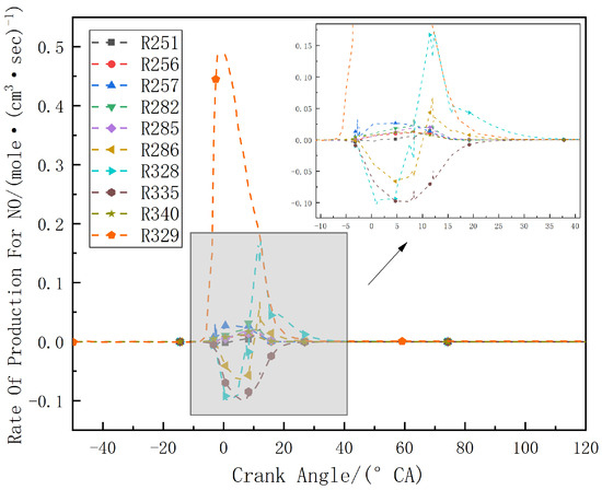 The major elementary reactions involving NO are shown in Table 6. The reaction rates of the major elementary reactions involving NO at a diesel fuel energy ratio of 28% are shown in Figure 16. It can be seen that NO is both produced and consumed during the combustion process. However, the production is predominant. Several reactions influence the NO content, including R286: NO + O(+M) <=> NO2(+M), R328: OH + NO <=> HONO, R329: H + NO2 <=> OH + NO and R335: HNO <=> H + NO. Among these, NO generation is primarily caused by R328 and R329. In the early stages of combustion, the forward reaction rate of R328, which tends to produce HONO, is relatively fast under high-temperature conditions as the cylinder temperature increases. In the later stages, when the OH concentration in the cylinder is high, it tends to favor the reverse reaction. In addition, around CA10, R286 and R335 contribute to the consumption of NO. As the combustion continues, ammonia reacts with OH and oxygen atoms through R230 and R231 to form amino NH2, and then NO is destroyed by NH2. However, this process typically occurs in the low-temperature range [36]; hence, the mole fraction of NO exhibits an initial increase, followed by a decreasing trend.