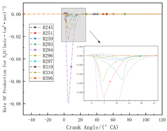 In conventional diesel engines, although combustion in the cylinder can produce N2O, the amount produced is typically negligible. In ammonia–diesel dual-fuel engines, however, this issue must be considered because N2O formation is one of the primary concerns associated with ammonia combustion. At low temperatures, NO2 reacts with ammonia to form N2O. However, as the cylinder temperature increases under high-temperature conditions, N2O is reduced back to N2. Reaction R294 plays a dominant role in the reduction of N2O to N2, as shown in Figure 17. Table 7 shows the main elementary reactions of N2O during combustion. Overall, N2O is primarily consumed during the combustion process. When the diesel energy ratio is less than 28%, the temperature in the cylinder decreases after combustion; at this point, ammonia reacts to produce N2O again. Therefore, in Figure 16, it can be seen that when the diesel energy ratio is below 28%, the N2O content gradually increases in the later stages of combustion; moreover, the lower the diesel energy ratio, the higher the N2O content.