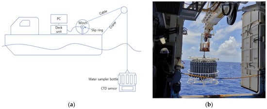 Overview of CTD system on the research vessel Isabu. (a) CTD system diagram; (b) an observation using a CTD system on the Isabu.