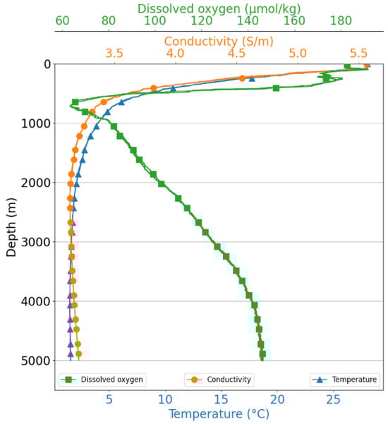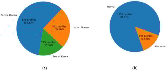 For the machine learning-based anomaly detection study of the CTD system, observational data were created as a dataset. The CTD dataset was acquired through 54 research voyages from June 2017 to April 2023 in the Indian Ocean, Northwest Pacific Ocean, and Korean waters. The location of the CTD data acquisition is shown in Figure 2, where it is marked as areas instead of coordinates, owing to data security issues related to resource exploration. Figure 3 shows the composition ratio of the dataset used in the study by observation area and by normal and abnormal data. The total number of profiles was 1414, consisting of 838 (59.3%) in the Pacific Ocean, 351 (24.8%) in the Indian Ocean, and 225 (15.9%) in the Korean territorial waters. In this study, anomaly detection was performed using only seawater temperature data among the entire CTD dataset. The seawater temperature data create a temperature profile of seawater by seawater layer as part of the CTD dataset. The normal profile and abnormal profile data labeling method involved direct inspection of each individual profile data point by referring to the descriptions in the field notes recorded at the observation site. The criteria for determining normal and abnormal profiles were based on the effective range of the values, the instantaneous rate of change, and empirical knowledge gained from actual field observations. Figure 4 shows the type of anomaly pattern for the CTD seawater temperature profile. Of the total 1414 profiles, 1218 (86.1%) normal and 196 (13.9%) abnormal individual profiles were individually identified and annotated for use as training data in the supervised learning model. Figure 5 shows the obtained CTD observation profile, where the y-axis shows the water depth and the x-axis shows the water temperature, conductivity, and dissolved oxygen.