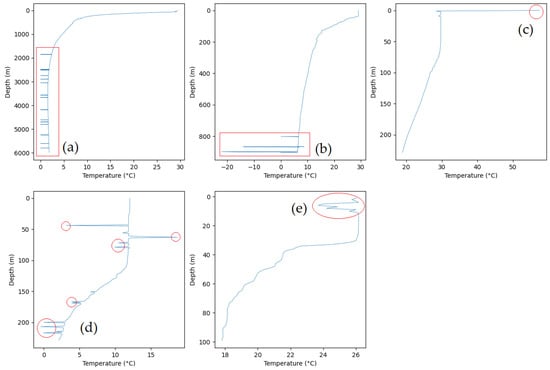 Types of CTD anomaly patterns in seawater temperature data. (a) The spike in the red box shows missing values. For visualization with missing values, it was shown as zero values. Missing values appear over the entire measurable range. (b) It is an anomaly pattern that exceeds the effective temperature range. The observed seawater temperature in the sea area cannot be below 0 degrees. It mainly appears when an electrical fault occurs in the system. (c) It is an anomaly pattern that exceeds the measured effective measurement range of the temperature sensor. The seawater temperature value that the temperature sensor can measure is up to 35 degrees. It appears mainly in the sea surface section. (d) A pattern of point anomalies in the observed temperature profile; it mainly appears when an electrical fault occurs in the system. (e) It is a collective anomaly pattern of the observed temperature profile. It mainly appears in the mixed layer.