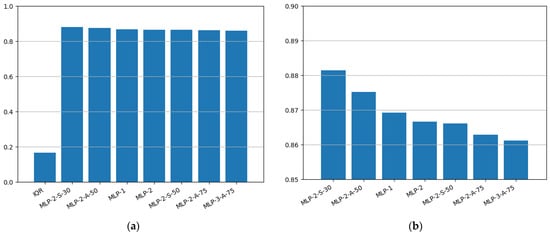First, Figure 6a shows the graph of the F1 score values of the IQR model and the top-7 machine learning model. In the result, machine learning-based anomaly detection models outperformed a traditional statistical method IQR. The performance of MLP-2-S-30 (0.882) resulted in a 71.4%-point improvement in the F1 score compared to the IQR model (0.168) as the baseline for performance evaluation in this study. This result shows that our approach is appropriate for anomaly detection of CTD seawater temperature profiles applying machine learning models.