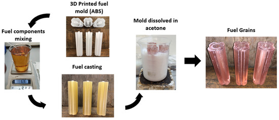 The water-breathing ramjet used in this study employed polyester as its fuel and gaseous oxygen as its oxidizer. Fuel grains were formed by casting a liquid mixture of polyester resin with 1% (of the polyester mass) of hardener (methyl ethyl ketone peroxide) into an acrylonitrile butadiene styrene (ABS) 3D-printed casting mold. After the polyester fully solidified, the ABS mold was dissolved in acetone. This process is illustrated in Figure 3. Oxygen was stored in a cylinder mounted on the rotating arm base and was supplied to the motor through a tube running along the boom into the motor. The solid fuel grain served as both the motor casing and the chamber. Additionally, a 3D-printed ABS casing (which did not provide any strength advantages compared to polyester) was incorporated to enable the attachment of screw rods, connecting the motor components while preserving the hydrodynamic shape of the motor. A front-end inlet facilitated the flow of incoming water via an attached 3.95 mm inner diameter stainless steel tube with a thin protective zirconia layer. Controlled flow of oxygen was distributed around the water tube into the fuel grain central port. At the fuel grain’s rear end, where the water tube ended, a stainless steel aft-mixing chamber was located. It allowed evaporation and good mixing of the incoming water with the hot combustion products before expelling through the choked converging exit copper nozzle, whose throat diameter was varied from 6.85 to 8.0 mm. Figure 4 presents a picture of the motor and a section view sketch with the main dimensions.