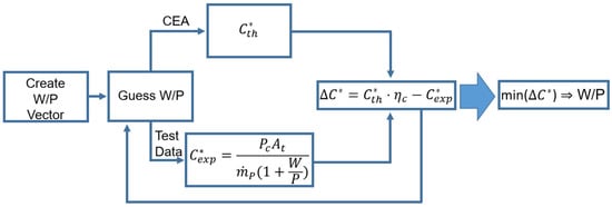 The calculation of the incoming water flow rate was based on the measured pressure and theoretical calculation from CEA. Assuming a combustion efficiency ( of 80%, which falls within the range of efficiencies observed in ref. [19] during static firings with identical propellant compositions, a value of the W/P ratio could be guessed; then, using CEA and the test results, the characteristic velocity was calculated in two different ways. The W/P value that minimized the difference between the measured and calculated characteristic velocity values was the chosen W/P ratio. A schematic flowchart outlining this calculation procedure is presented in Figure 5.