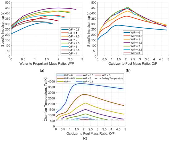 (s), predicted by theoretical calculation vs. the W/P ratio spanning from 0 to 3, across various O/F ratios ranging from 0.5 to 3. (b) Standard specific impulse, (s), and (c) chamber temperature, predicted by theoretical calculation vs. the O/F ratio spanning from 0.1 to 5, across various W/P ratios ranging from 0 to 3.