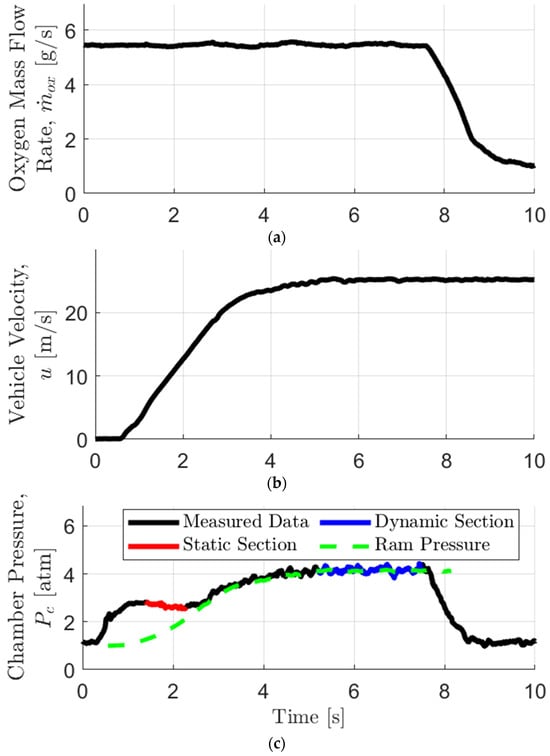 Figure 7a–c displays the results of a typical experiment obtained during dynamic firing under underwater cruise conditions. Figure 7a presents the oxygen mass flow rate, starting before the ignition of the motor and showing a practically constant value of 5.5 g/s throughout the operation. Figure 7b displays the vehicle velocity, dictated by the central electric motor control, starting with a short period of zero motion, then increasing gradually to the desired operating velocity of 25 m/s, and remaining constant until the end of the test. Focusing on the motor pressure chamber (Figure 7c), the sequence begins with motor ignition reaching a “static” section (red color), characterized by the pressure resulting from the motor operation without the addition of water; this stage continues as long as the ram pressure (in green) is lower than the motor chamber pressure. Once the vehicle velocity reaches a sufficiently high level, i.e., the ram pressure exceeds the motor chamber pressure, water flows into the motor through the front inlet, causing the pressure to increase until it reaches the stagnation pressure at the desired velocity (approximately 4 s of dynamic section marked in blue). It results in a significant increase in motor thrust and specific impulse. Figure 8a presents a photograph of the motor shortly after ignition. Figure 8b presents a photograph of the water basin and the underwater moving vehicle during the dynamic experiment, revealing a bright flame observed through the translucent polyester fuel grain and casing of the motor.
