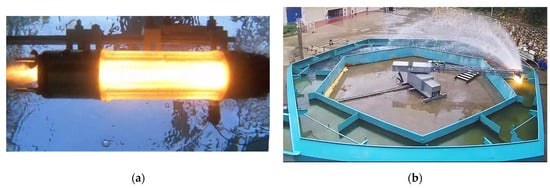 Photographs of (a) the tested marine ramjet after ignition, (b) the water basin, and the moving vehicle during the dynamic underwater experiment.