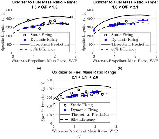 Theoretical, static [19], and dynamic (this study) standard specific impulses vs. W/P ratio for different O/F ranges: (a) O/F range 1.5–1.8; (b) O/F range 1.8–2.1; and (c) O/F range 2.1–2.6.