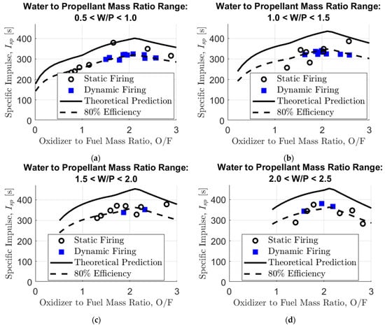 Theoretical, static [19], and dynamic (this study) standard specific impulses vs. O/F ratio for different W/P ranges: (a) W/P range 0.5–1; (b) W/P range 1–1.5; (c) W/P range 1.5–2; and (d) W/P range 2–2.5.
