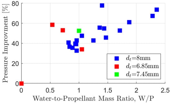 where represents the ram (stagnation) pressure; is the ambient water pressure; and is the water density. Figure 11 illustrates the measured chamber pressure of the motor as a function of its speed, along with the theoretical ram pressure based on Equation (9). The majority of our test results reached the desired stagnation pressure, thereby increasing the motor pressure and thrust. However, in some cases, the difference between the motor chamber pressure and the ram pressure was relatively large, requiring better adjustments to the operating conditions. To address this issue, a suitable nozzle diameter ( needed to be designed for these specific conditions. This resulted in motor pressure values being closer to the ram pressure, leading to better performance under desired conditions, as shown in Figure 11 and marked in red and green. The improvement in the chamber pressure in each experiment due to water ingestion compared to its static section pressure versus the W/P ratio is presented in Figure 12. The overall trend indicates a substantial increase in pressure compared to the no-water-addition case with a rise in the W/P ratio, approaching 70% improvement in pressure. The dispersion in the results may be attributed to the static section pressure dependence on the propellant mass flow rate, which is not represented in the plot, as well as the different nozzle diameters used, generating higher chamber pressures for a smaller diameter.