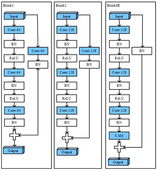 The diagram is divided into three main sections, each of which represents a different block, and each of which has a different hierarchy and operation. Each block starts with “Input” and then passes through multiple layers, ending up with “Output”. First, the Block1 part consists of three sequentially identical structures, each of which contains a convolution layer (CN), followed by a ReLU activation function and a batch normalization (BN) layer. After these three sets of operations, the output of Block1 is obtained. Block2 is similar to Block1, but with an increased number of convolution kernels per convolution layer. The input data in the BlockSE module first pass through several convolution layers (Conv), normalization layers (BN), and activation layers (ReLU), and finally through a channel attention mechanism layer (CAM), which can correlate the feature maps in the neural network with the classification results, thus helping to understand the classification basis of the network. The feature map is formed by multiplying and adding the parameters (weight matrix W) of the last fully connected layer and the final output feature map set; that is, the display model is based on which feature maps for decision classification. The extraction of CAM generally occurs in the convolution layer, especially in the last convolution layer.