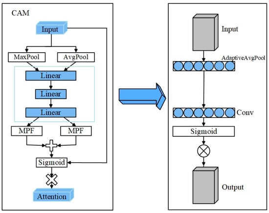 Channel attention mechanism is a method used to enhance the neural network to learn feature representation between different channels, which can improve the effectiveness of feature representation by assigning different weights to different channels []. This mechanism has been widely used in Squeeze-and-Excitation Networks (SENet) and has been proved to significantly improve the performance of various computer vision tasks. In the traditional channel attention mechanism, the feature representation of different channels is usually adjusted by calculating the weight of each channel. Although this method can improve the network performance, it still has some limitations; for example, it may ignore the correlation between channels, resulting in information loss. This feedback connection allows the network to transfer information between different layers, so as to make better use of the correlation between channels. This feedback connection can help the network to better capture the dependence between specific channels, and improve the representation ability and generalization performance of the model. The improved CAM model is applied to the improved CNN model, as shown in Figure 4, which further improves the performance of the neural network in feature learning and representation.